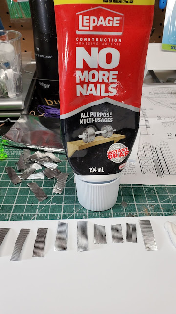 Because I was fastening metal foil to styrene I did some experiments to determine the best adhesive to attach the panels. The adhesive needed to be very sticky yet dry clear and be strong enough that the panels would not peel off. I settled on one of my favourite adhesives, No More Nails by Lepage as seen here: